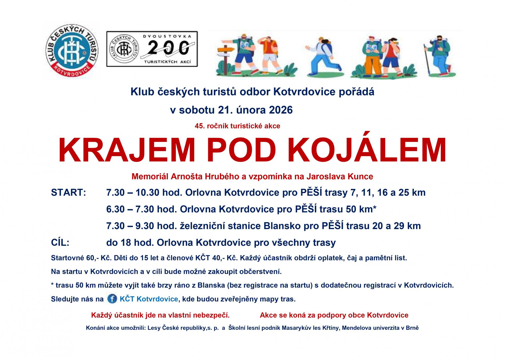 Klub českých turistů odbor Kotvrdovice pořádá v sobotu 21. února 2026 45. ročník turistické akce Krajem pod kojálem.Memoriál Arnošta Hrubého a vzpomínka na Jaroslava Kunce.