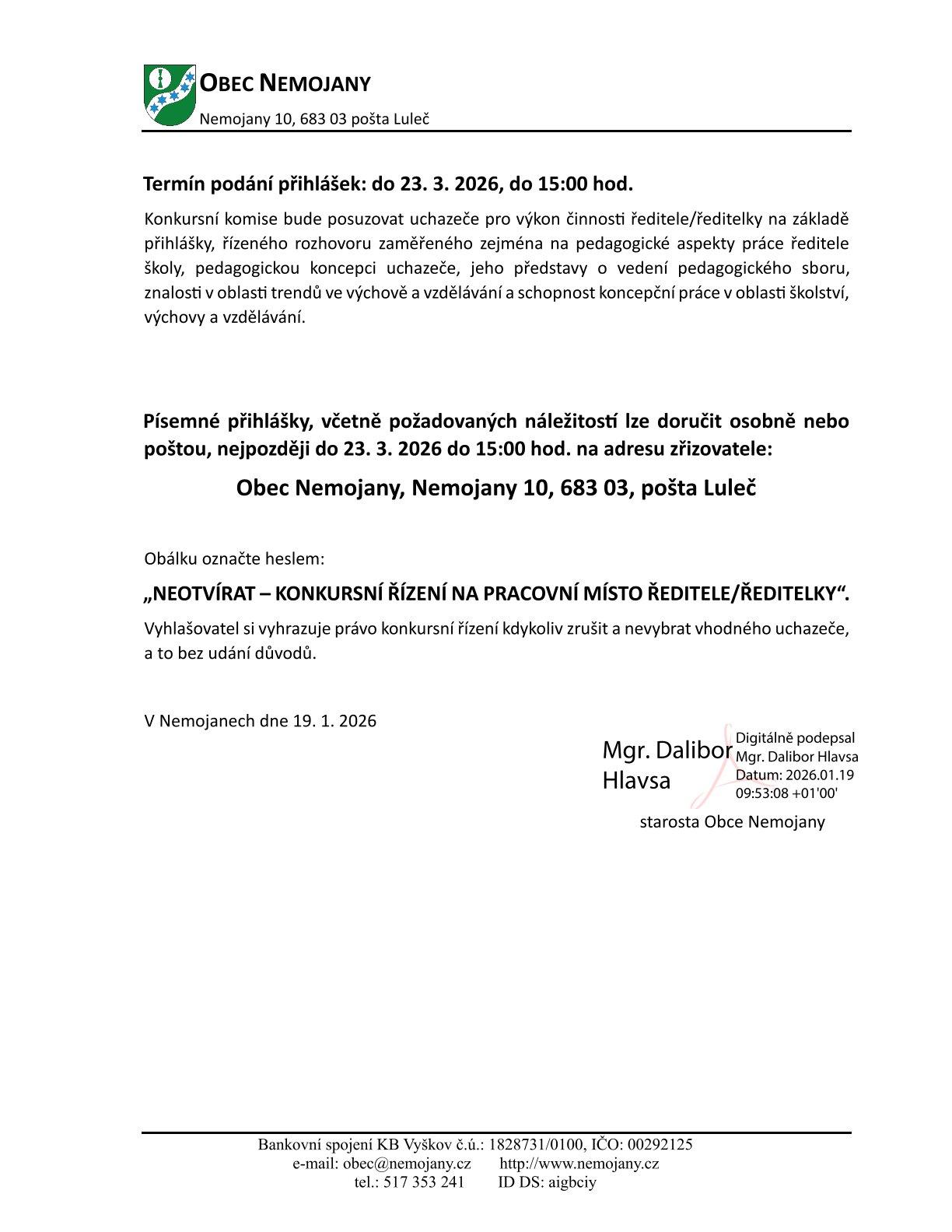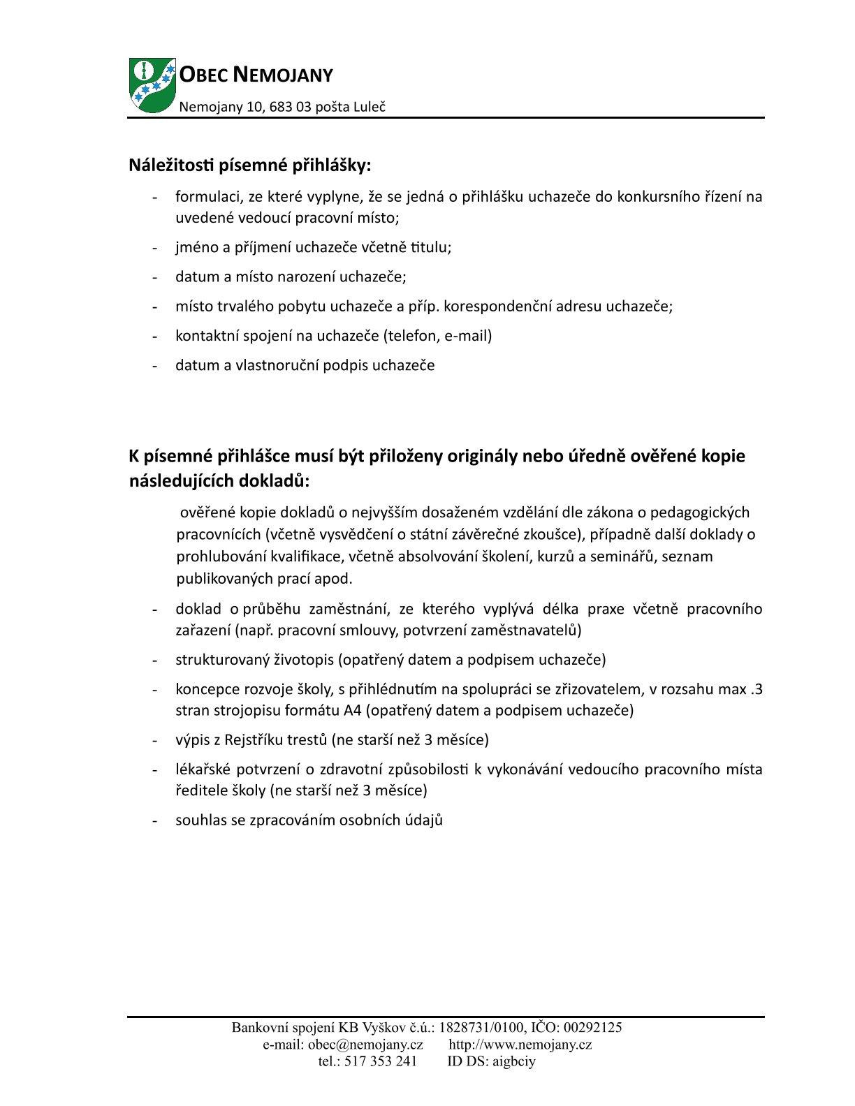 Nemojany - Konkurs na ředitele/ředitelku MŠ a ZŠ